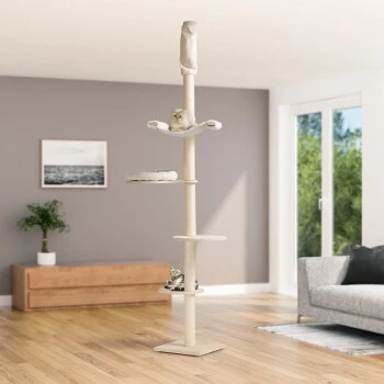 Aufgrund seiner Größe ist der Kratzbaum sehr raumsparend und kann so gut in jede Wohnungseinrichtung integriert werden. Dank der Höhenverstellbarkeit von 2,16 bis auf bis zu 2,46 Metern kann der Deckenspanner ganz einfach der Deckenhöhe angepasst werden.
