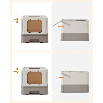 [Leicht zu entleeren & reinigen] Mit einer ausziehbaren Schublade lässt sich das Katzenklo leicht entleeren und mit neuer Streu füllen. Mitgelieferte Schaufel und Bürste helfen, den Abfall zu schaufeln und die Streu oben oder in den Ecken zu reinigen [Weniger Schmutz] Das Gitter-Design oben verringert die Spurenbildung und lässt die Streu zurück in die Box fallen. Dadurch wird die Spurenbildung im Haus reduziert und Ihr Zuhause bleibt sauber [Kein Auslaufen] Der verlängerte Rand oberhalb der Box und ein geschlossener Boden darunter verhindern, dass Streu oder Katzenurin auf den Boden gelangen. Ein praktischer Helfer, wenn Ihre Katze gerne gräbt oder steht, um zu pinkeln! [Perfekt für große und dicke Katzen] Die Innengröße der Katzentoilette beträgt 50 x 40,5 x 34,5 cm und bietet somit viel Platz für große Katzen. Wie sieht es mit der Oberfläche aus? Keine Sorge, sie kann bis zu 15 kg tragen [1 Tür, 2 Konfigurationen] Die Tür lässt sich so einstellen, dass sie nur einseitig aufgeht und die obere Öffnung als Ausgang genutzt werden kann. Auch ein beidseitiges Öffnen der Tür lässt sich einstellen – je nach Bedarf. Wenn Ihre Katze ein Anfänger ist, können Sie die Tür auch entfernen [Kein Werkzeug erforderlich] Dank des Klapp-Designs und der leicht verständlichen Anleitung ist das neue Katzenmöbel Ihres Freundes in 5 Minuten oder weniger fertig!Feandrea Hinweise: