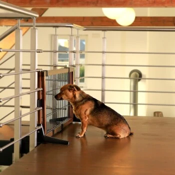Das Schutzgitter ist in zwei unterschiedlichen Höhen erhältlich und kann vielseitig eingesetzt werden – als Treppenabsperrung, Raumtrenner oder auch als Eingangssperre an Türen.