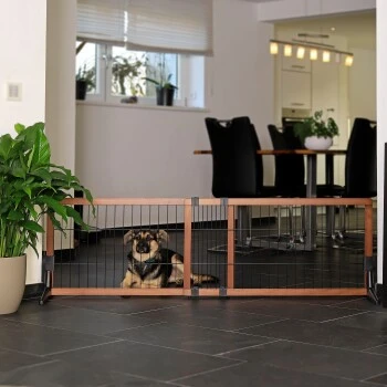 - ROBUSTE MATERIALIEN. Gefertigt aus Pinienholz und schwarzem Stahldraht ist dieses Hundeschutzgitter sehr robust und hält ihren Tieren stand. Das Pinienholz wirkt optisch sehr ansprechend.