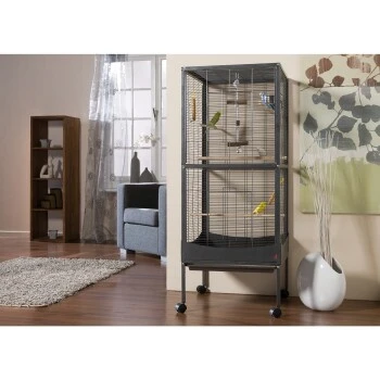 - Käfig auf vier Rollen (mit zwei Festellbremsen), die ein bequemes und leichtes Verschieben der Voliere ermöglichen