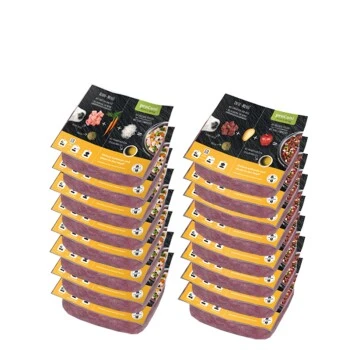 Unsere Menüs sind ein vollwertiges und ausgewogenes Alleinfuttermittel und enthalten bereits alle Komponenten, die Ihr Hund für den täglichen Bedarf benötigt. Ausgestattet mit allen wichtigen Eiweißen, Fetten, Mineralstoffen, Vitaminen und Spurenelementen versorgen unsere Premium-Komplettmenüs Ihren Hund vollständig, gesund und artgerecht. Folglich müssen dem proCani BARF Menüs keine weiteren Zutaten oder Zusätze mehr hinzugefügt werden. Einfach das Frostfutter auftauen lassen und verfüttern. Deinem Hund während der Fütterung stets frisches Wasser anbieten.