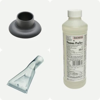 Im Lieferumfang enthalten: 1 handliche Sprühex-Polsterdüse, 1 ProTex Reinigungskonzentrat, 1 praktische Siphondüse
