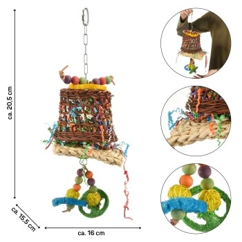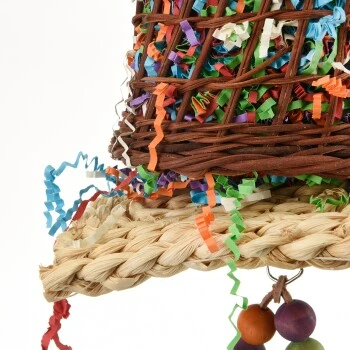 Es besteht aus einer Glocke aus Rattan geflochten gefüllt mit bunten Papierstreifen. Eine Maisstrohmatte schließt die Glocke nach unten ab. Eine zusätzliche Verzierung und doppelten Knabberspaß bieten die Luffa-Scheiben, Rattanbälle und Holzkugeln.