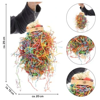 Alles ist auf eine Kette aus Edelstahl gefädelt. Die Holzteile können von den Vögeln um den Ball gedreht werden.