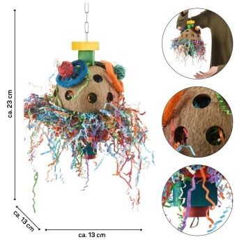 Es besteht aus einer Kokosschale mit Löchern in welcher ein Schredderball befestigt wird.