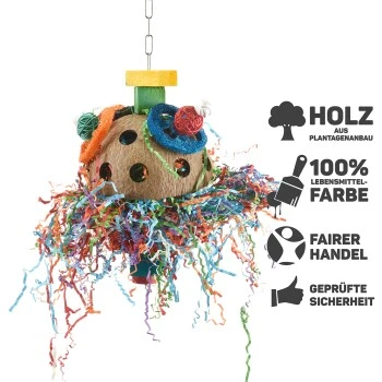 Die Kokosschale kann nach Zerstören des Spielzeuges z.B. als Spielzeugkörbchen weiter verwendet werden.